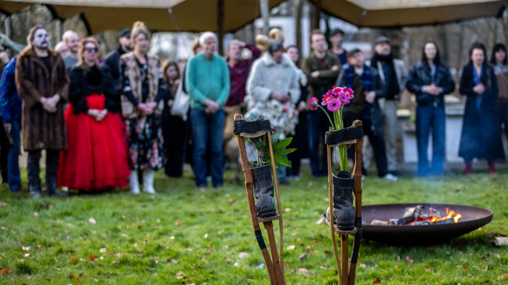 Literally standing in the middle of the playing surface, another dimension is added for the audience. Above the heads, the theatrical reality takes place, which can be done through the use of large moving objects and stilts. At height, the players thus float, as it were, above the heads of the audience and create another reality. At street level, the effort and technique required for this is visible. One finds oneself, as it were, between the wings. In this duality, the spectator has a choice. One can lose oneself in the story on an imaginary level and at the same time, on a real level, experience the efforts required to achieve this. In addition to all this, live music contributes greatly to the rhythm and dynamics of the performance. As players, the musicians are an integral part of the story.